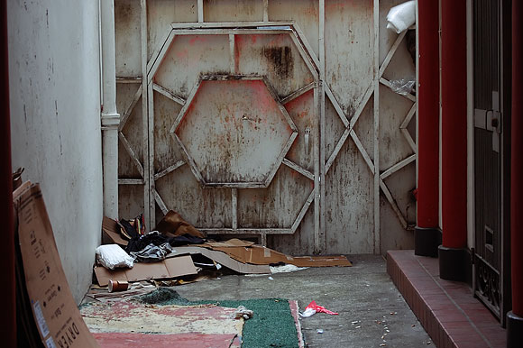 A spirit cat guards the abandoned back yard of a house by Ocean Beach.