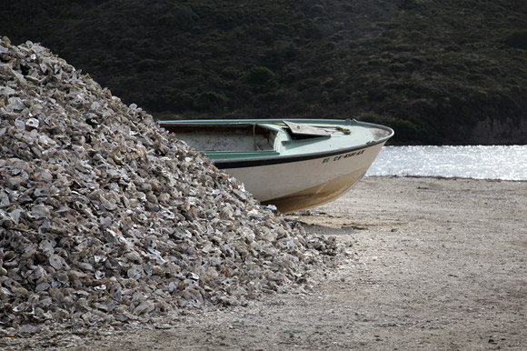 Spent oyster shells and dingy.