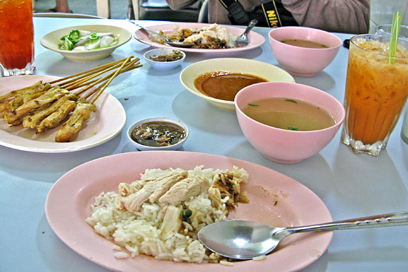 Sometimes in life, a person has such an exceptionally delicious lunch that even putting adjective in italics doesn’t do justice to how profoundly insanely amazing it was. Today was such a time in life. J. and I went to a restaurant on Inthawarorot Road that specialized in boiled chicken served over rice. The place was doing brisk business, always a good sign. The chicken and rice served on their own are quite bland. But this is Thailand, so that won’t do. Alongside is a sauce of unknown but sorcery-grade ingredients. These mystery flavors pump insane amounts of intense deliciousness into any chicken they touch. The sauce explodes with tastes of soy and sugar, smoke and salt, citrus. It feels like you are eating the essence of every Thai meal ever prepared since time began. Only he with an open palate can accept this flavor, can become one with it.