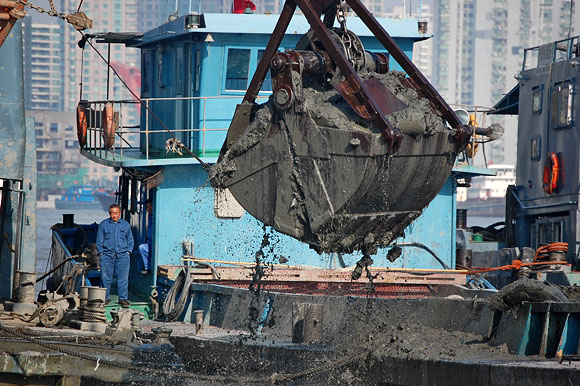 Man in blue watches as a dredge hauls mud from near the ferry terminal.