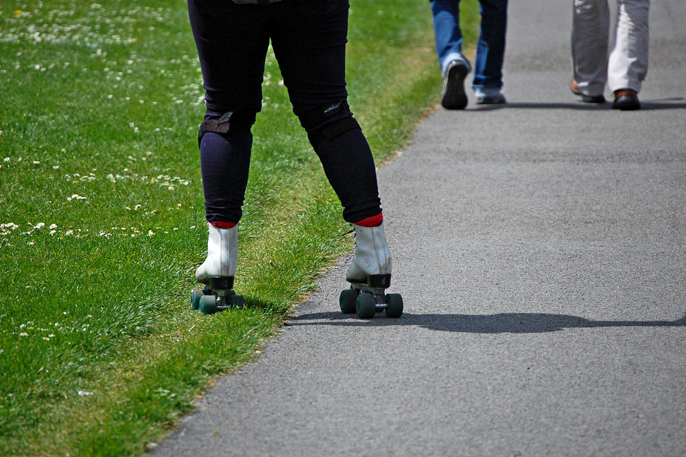 Meanwhile, a grey haired woman on rollerblades was dancing to the music as another skater blew bubbles.