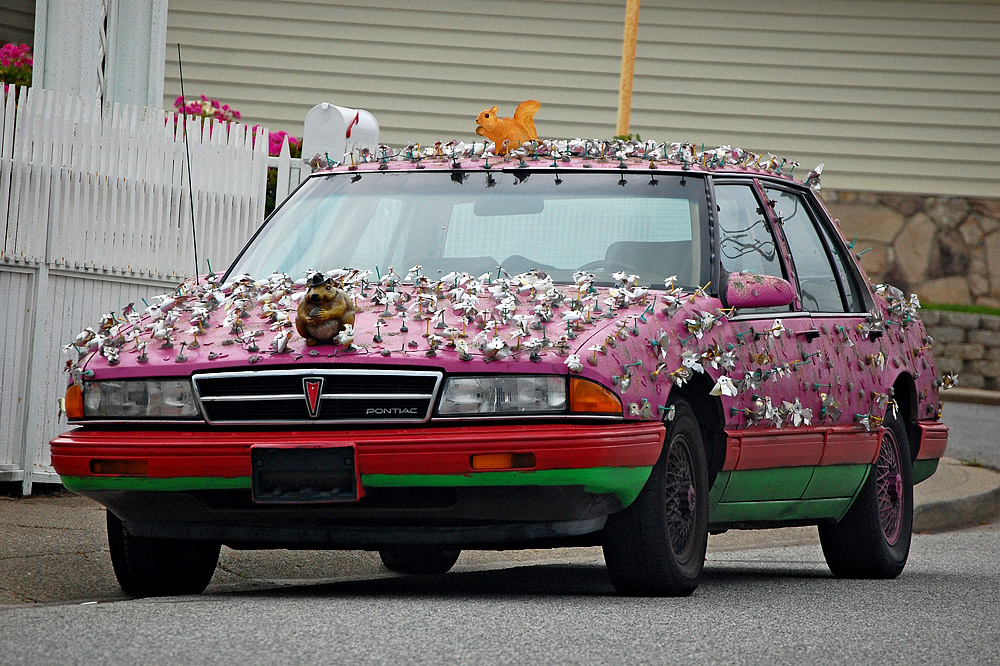 Art car covered in aluminum spinners.