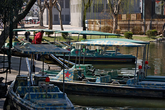 We arrived at Luxun Park. Outside the main gates, we got a cheap fried egg and bread snack from a street vendor, then Japanese style noodles and rice for lunch. Coffee from the teal mermaid. The park was full of people singing, playing instruments, badminton, soccer, whirling tops, flying kites, strolling, playing cards, playing on amusement rides, bumper boats, and sitting in benches.
