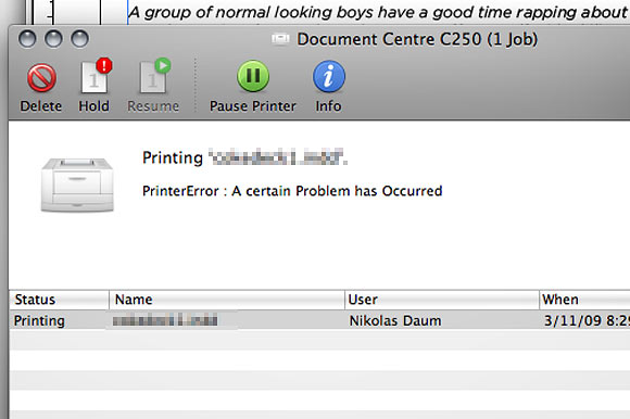 Printing out certain documents at work produce this vague and oddly capitalized error in the print monitor. And even though a certain problem has occurred, the file prints out just fine.
