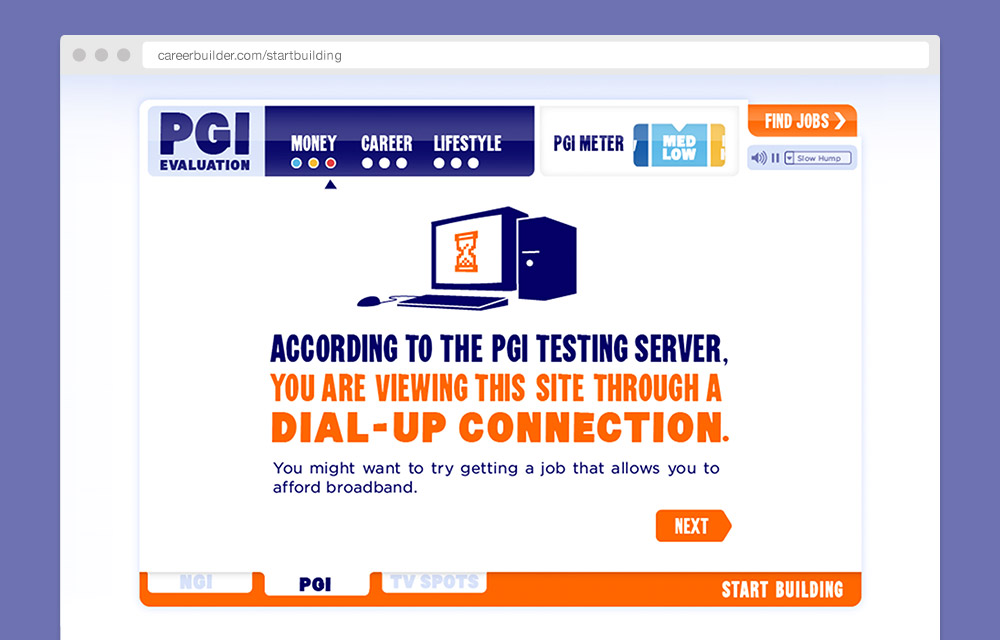 This website, along with some commercials and print, were part of Careerbuilder’s “Start Building” campaign. Part of the site measured the nation’s career happiness, calculated using real data provided by job posts/searches. Another part meausered the user’s gruntledness. From a large pool of questions, we probed the deepest crevices of the user’s working mind using a variety of methods from webcam, mic, and more. Many of the questions were also made into rich media banners.